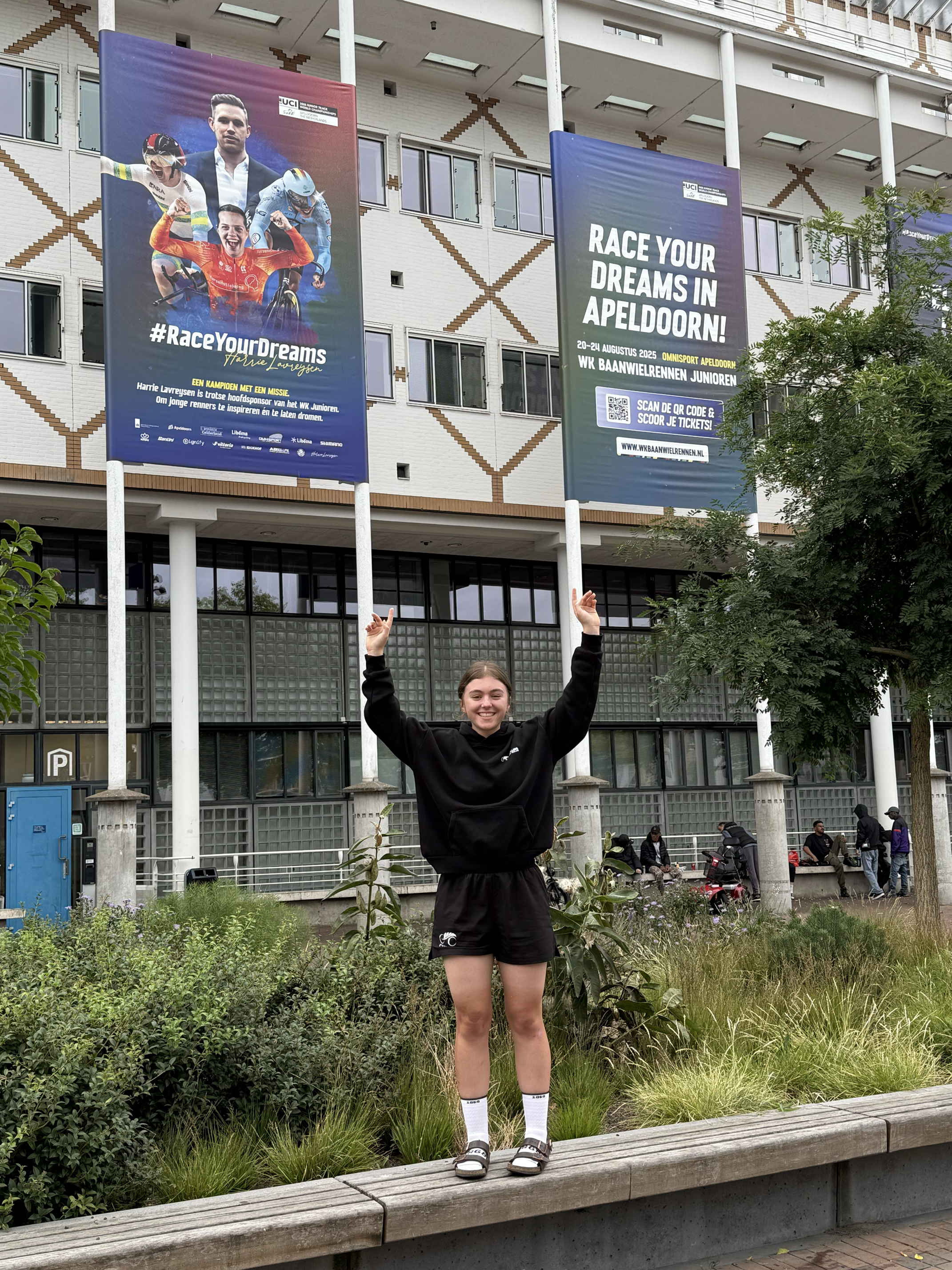 We’re in Apeldoorn to see and support our grand-niece who is representing New Zealand in the world junior cycling championship races being held here this week (and being advertised on the posters in the background). She does endurance track racing, and is a very talented and determined young woman!